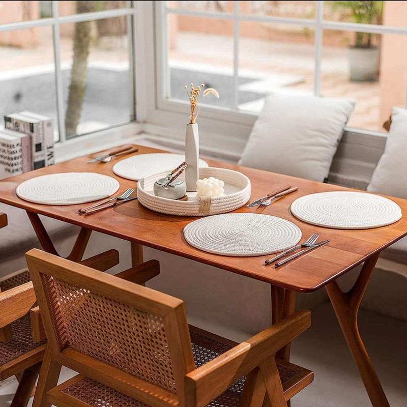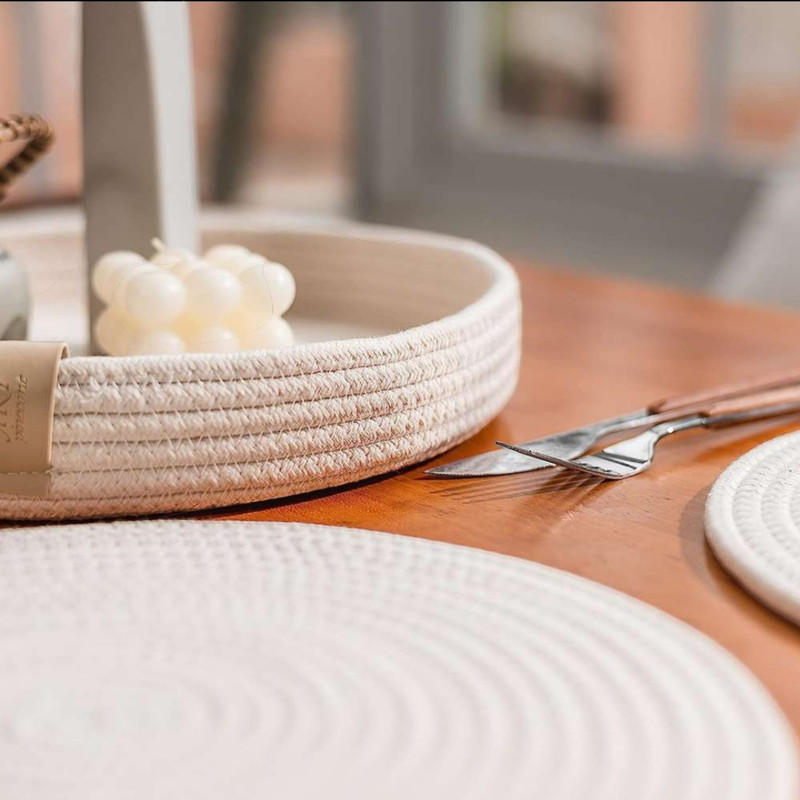 محصول پیش رو شامل ۴ عدد زیر بشقابی و یک عدد سبد نان می باشد که زینت بخش میز شماست. از قیطان نخ پنبه دوخته میشود و یک ست چهار نفره میباشد .