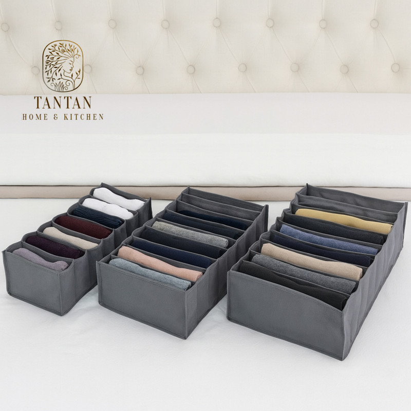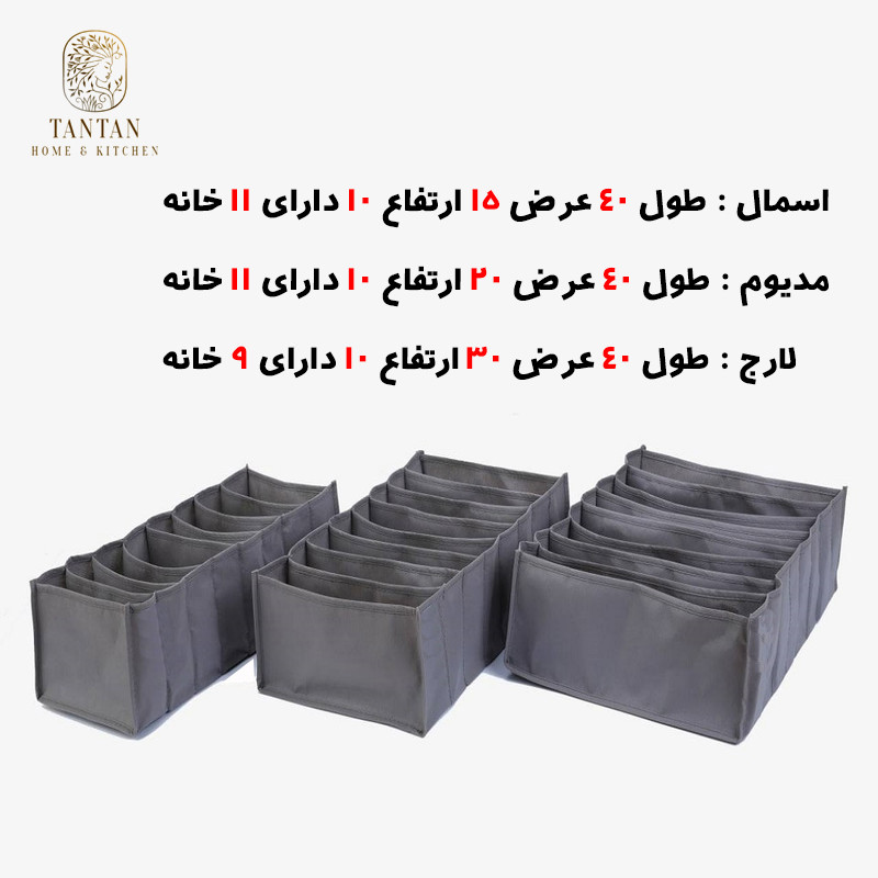 نظم دهنده کشو تن تن مدل خانه من بسته 3 عددی شامل سه سایز نظم دهنده کشو از جنس پارچه اسپان قافد اسکلت به سایزهای A) طول 40 عرض 15 ارتفاع 10 B) طول 40 عرض 20 ارتفاع 10 C) طول 40 عرض 30 ارتفاع 10 می باشد. این محصول فقط در دو رنگ طوسی تیره و سفید تولید میشود