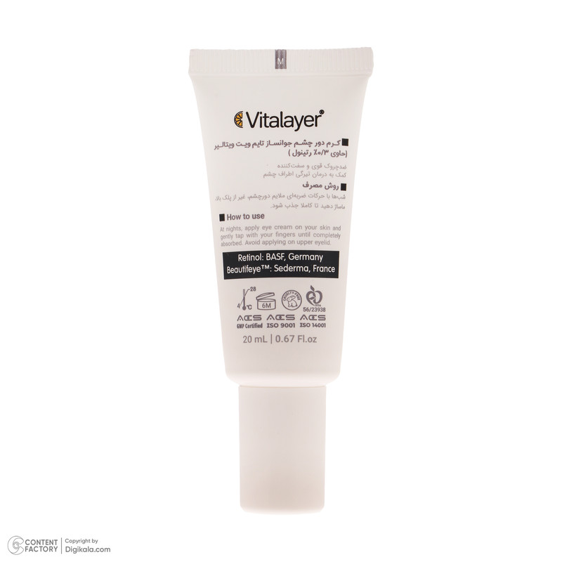 کرم دور چشم تایم ویت ویتالیر دارای ویتامین سی کپسوله است که قدرت بالایی در سنتز کلاژن دارد، این ترکیب موجب می شود خطوط پنجه کلاغی اطراف چشم رفع شده و علاوه بر آن با داشتن ترکیب رتینول که یک ضد چروک قوی و شناخته شده است باعث جوانسازی دور چشم می شوند. یکی دیگر از ترکیبات موثر آن Beautifeye است که خاصیت ضد افتادگی دارد. همچنین به کمک ریز مولکول های هیالورونیک اسید چروک های سطحی را پر کرده و باعث افزایش رطوبت ناحیه اطراف چشم می شود.با توجه به نازک و حساس بودن پوست اطراف چشم محصولاتی که برای این ناحیه استفاده می شوند باید فاقد پارابن و اسانس باشند.