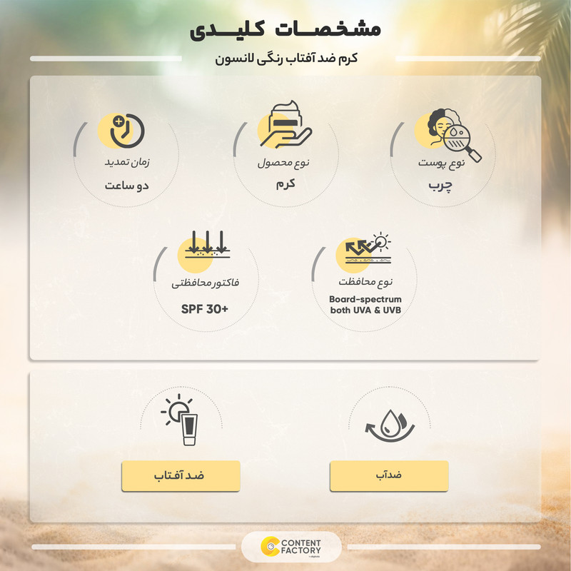 کرم ضدآفتاب لانسون به طور ویژه برای پوستهای چرب طراحی شده است. ترکیبات خاص این محصول، از تولید چربی اضافی جلوگیری کرده و بافتی مات و طبیعی به پوست میبخشد، بدون اینکه باعث ایجاد براقی ناخواسته شود. حجم 40 میلیلیتری این کرم، آن را به یک گزینهی ایدهآل برای استفاده روزانه و حمل در کیف دستی تبدیل کرده است. این محصول با شماره مجوز 6274929، از تمامی استانداردهای لازم برخوردار بوده و با اطمینان خاطر میتوانید از آن استفاده کنید. کرم ضدآفتاب لانسون با بافت سبک و فرمولاسیون رنگی خود، علاوه بر ایجاد لایهای محافظ، به شما کمک میکند تا ظاهری زیبا و بینقص داشته باشید. اگر به دنبال ترکیبی از محافظت و زیبایی هستید، این کرم ضدآفتاب رنگی گزینهای بینظیر برای شماست. محافظت کامل از پوست خود را با کرم ضدآفتاب لانسون تجربه کنید و از پوست خود در برابر آسیبهای ناشی از اشعههای مضر خورشید محافظت نمایید.