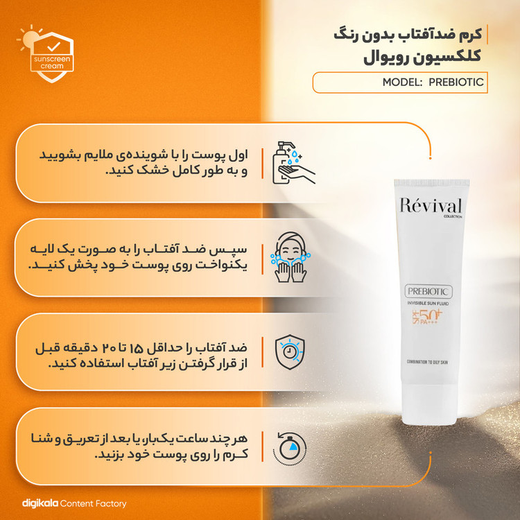 راهنمای استفاده : 15 دقیقه قبل از قرار گرفتن در معرض آفتاب روی پوست تمیز استفاده شود . هر 5 ساعت یکبار تمدید نمایید .