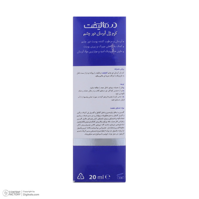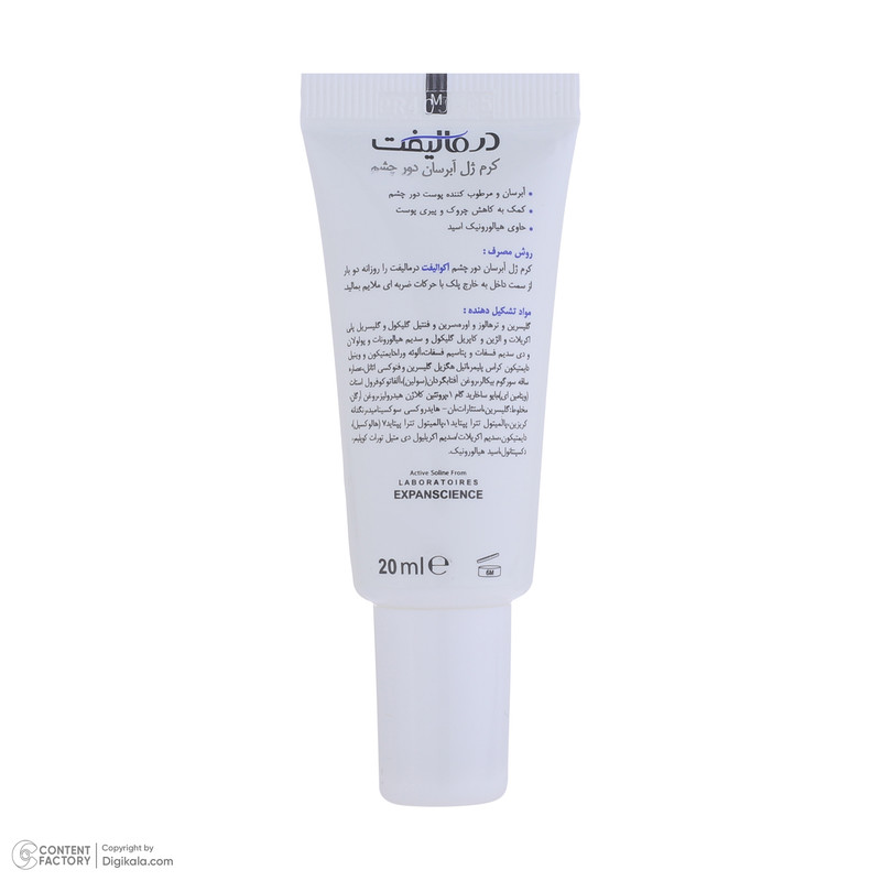 کرم ژل آبرسان دور چشم آکوالیفت درمالیفت با داشتن فرمولاسیون سبک و جذب سریع و ترکیبات موثر حاوی هیالورونیک اسید، ویتامین E و … به آبرسانی و مرطوب کردن پوست ناحیه دور چشم کمک میکند و باعث کاهش خشکی، خطوط ریز و پف زیر چشم میشود. به دلیل ترکیبات ملایم و عدم ایجاد حساسیت، این محصول برای مراقبت روزانه از دور چشم مناسب خواهد بود. به طور کلی شرکت کیمیا فارمد گیتی گستر پس از سالها تحقیق و کسب تجربه در زمینه فرمولاسیونهای پیشرفته موفق به تولید ژل کرم آبرسان دور چشم درمالیفت گردیده است که گام مهمی در زمینه جوانسازی پوست برداشته است.