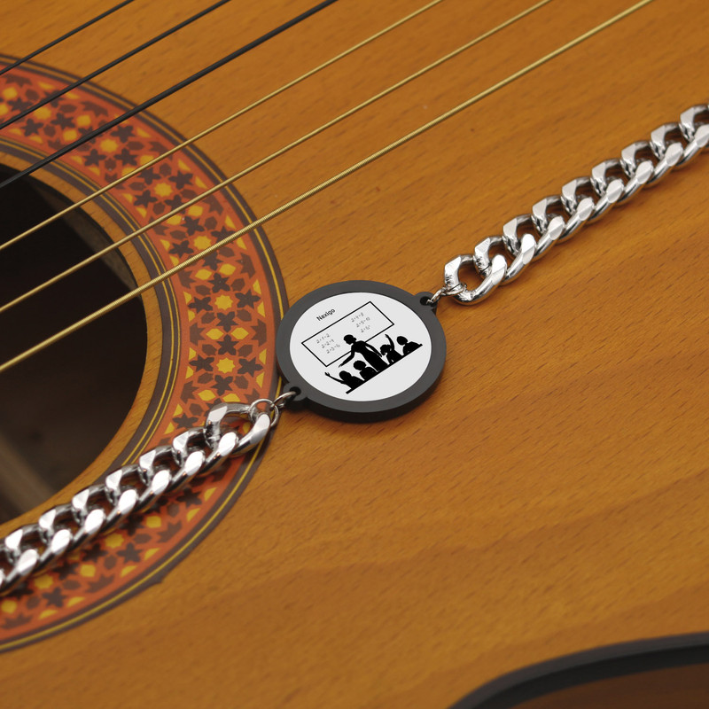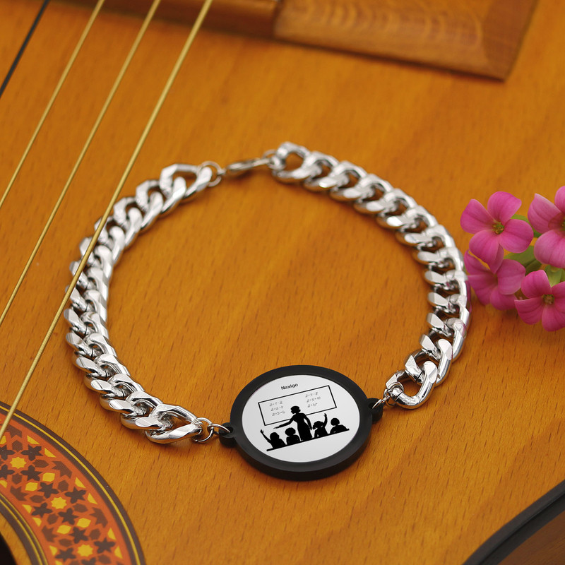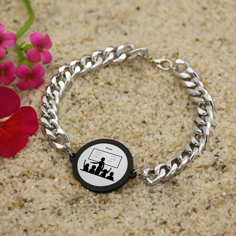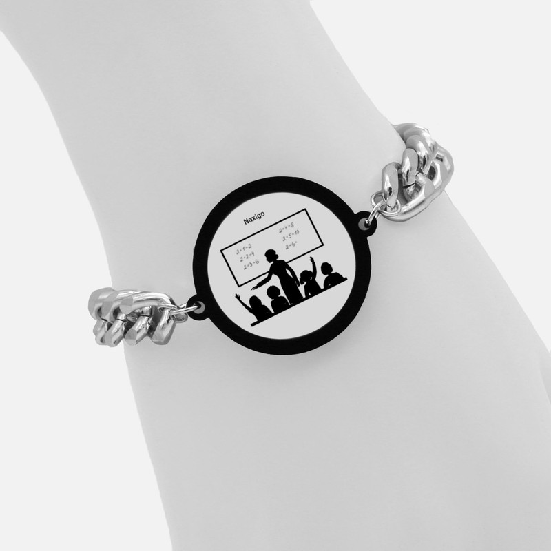 دستبند به عنوان یک اکسسوری جذاب و زیبا برای تمام افراد و تمام سنین به شمار می آید. دستبند ناکسیگو طرح معلم ساخته شده از جنس زنجیر استیل و پلاک اکریلیک است. کاملا ضد حساسیت بوده و رنگ ثابت دارد. طول دستبند 20 سانتی متر است و قطر آویز حدودا 3 سانتی متر می باشد. محصول با بسته بندی شیک و مناسب جهت هدیه ارائه می شود.
