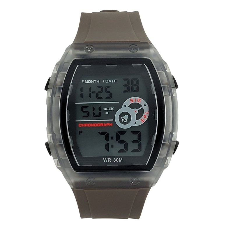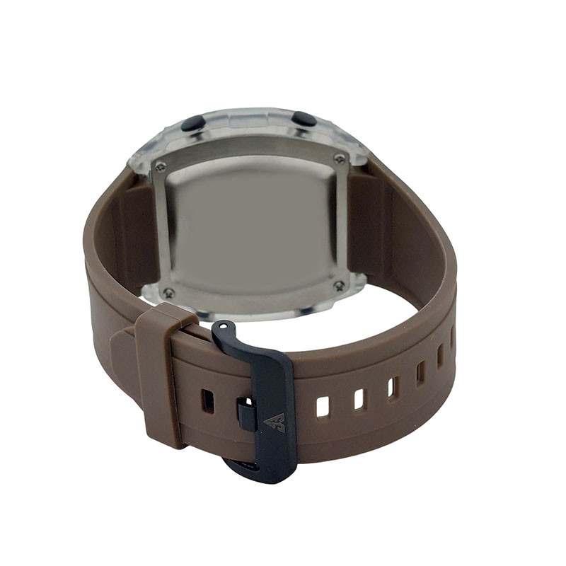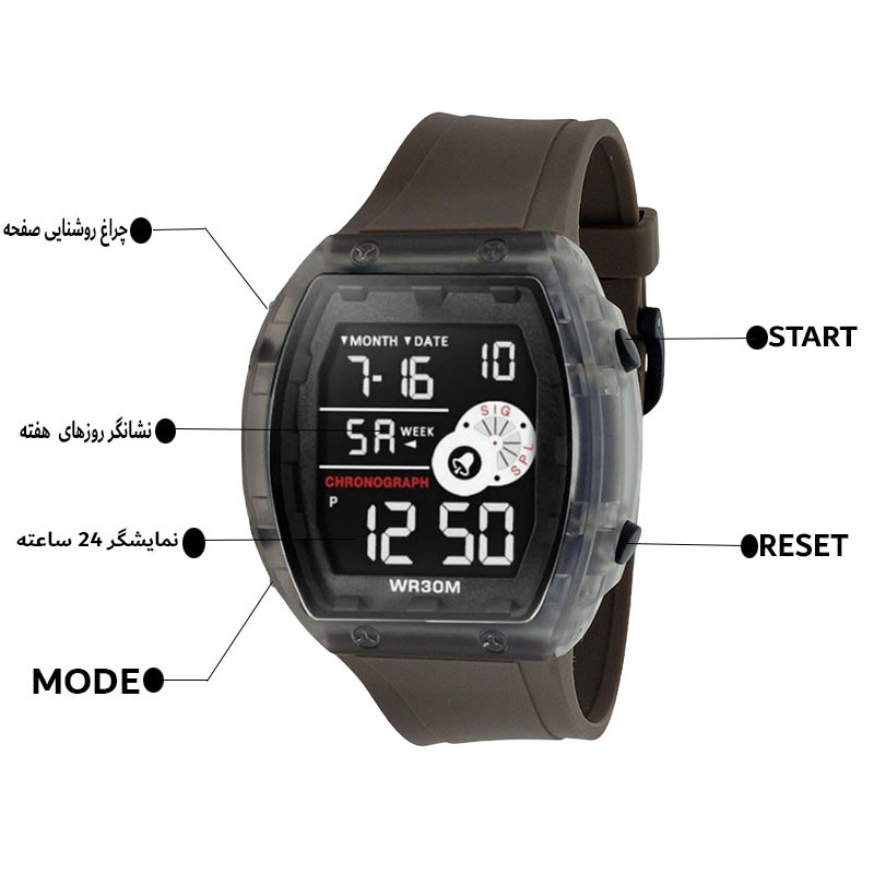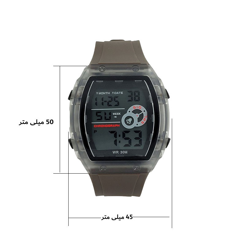 دستهبندی: ساعت دیجیتال زنانه و مردانهرنگ بدنه: بیرنگرنگ صفحه: مشکینوع موتور ساعت: کوارتزاستایل کاربری: ورزشی , روزمره , لوکس , فشن , خلبانیفرم صفحه : چندضلعیجنس شیشه : رزینجنس بدنه : رزیننوع قفل بند : سگکی سادهجنس بند : TPUقطر صفحه ساعت : 45 میلیمتروزن : 100 گرممنبع انرژی : باتریقابلیتهای تخصصی ساعت : صفحه طرحدار , آلارم , کرنوگراف , ضدآب , تاریخشمار , نور پسزمینه , نمایش 24 ساعتهرنگ بند : قهوهاینمایش بیشتر