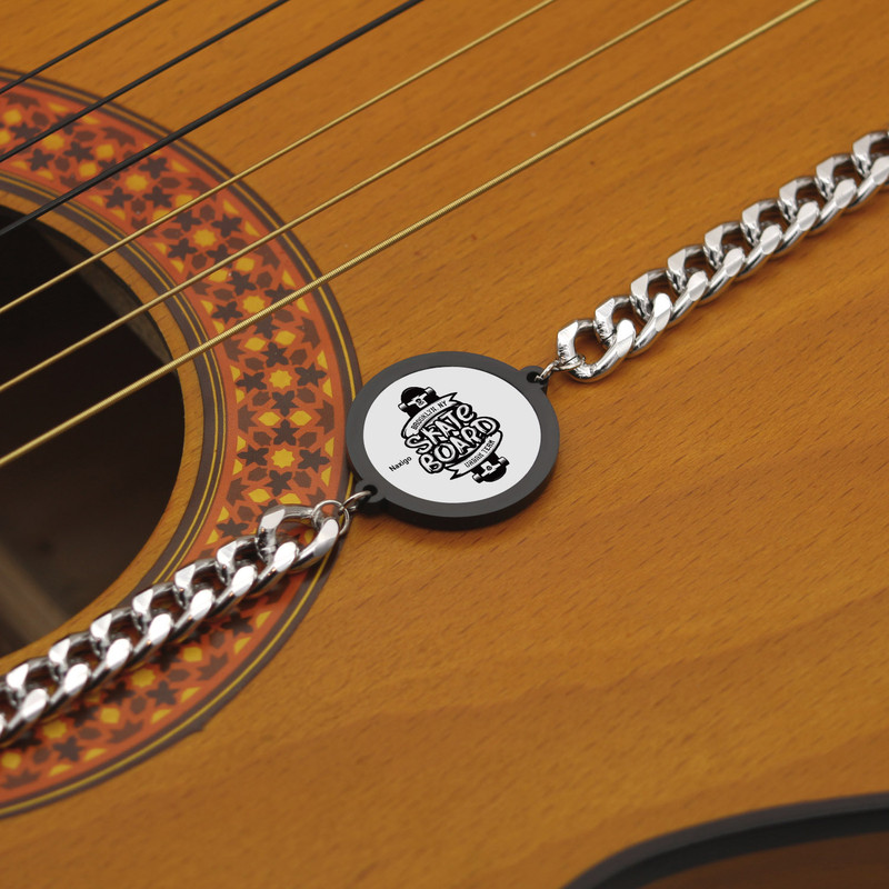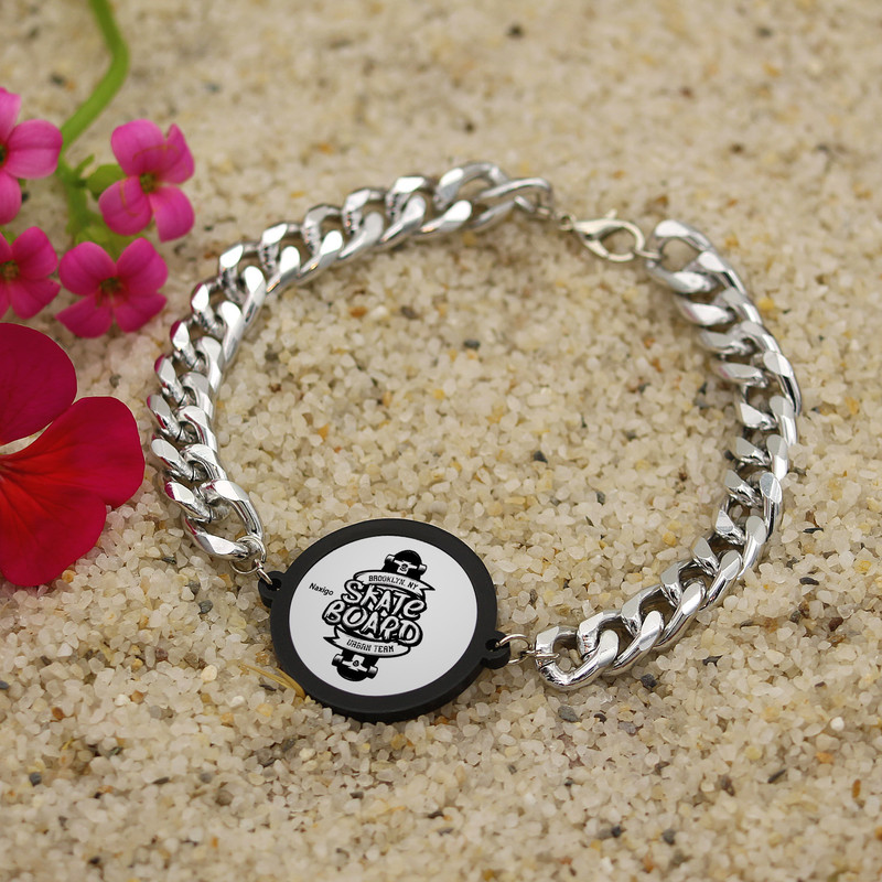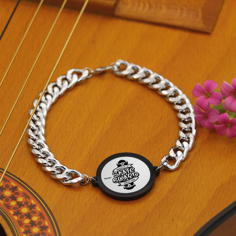 دستبند به عنوان یک اکسسوری جذاب و زیبا برای تمام افراد و تمام سنین به شمار می آید. دستبند ناکسیگو طرح اسکیت برد ساخته شده از جنس زنجیر استیل و پلاک اکریلیک است. کاملا ضد حساسیت بوده و رنگ ثابت دارد. طول دستبند 20 سانتی متر است و قطر آویز حدودا 3 سانتی متر می باشد. محصول با بسته بندی شیک و مناسب جهت هدیه ارائه می شود.