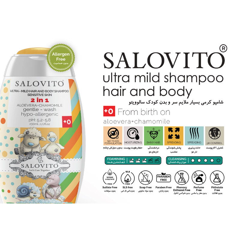شامپو بسیار ملایم سر و بدن سالوویتو بر مبنای پوست بسیار حساس نوزادان و کودکان و قوانین سخت گیرانه اتحادیه اروپا در مورد محصولات کودک طراحی شده و با ساختاری بدون سولفات،بدون پارابن ،بدون سدیم کلراید،بدون عطر ،بدون مواد صابونی ،بدون فنوکسی اتانول و بدون اس ال اس و اس ال ای اس مناسب شستشوی روزانه تمام سنین از بدوتولد میباشد.عصاره بابونه و آلوئه ورا خالص استفاده شده در شامپو بسیار ملایم سر و بدن سالوویتو موجب بازسازی وترمیم التهابات پوستی و مرتب سازی بافت کوتیکول مو و در نهایت ایجادموهائی براق و حالت پذیر میگردد.این محصول فاقد مواد محرک و سوزش آور چشم میباشد و با داشتن pHمتعادل شده 5.5 سبب حفظ شرایط فیزیولوژیک پوست میگردد.این محصول برای تمام افراد با پوستهای حساس ،بعد از عمل های زیبائی و کاشت مو و شستشوی روزانه آرایش توصیه میگردد.
