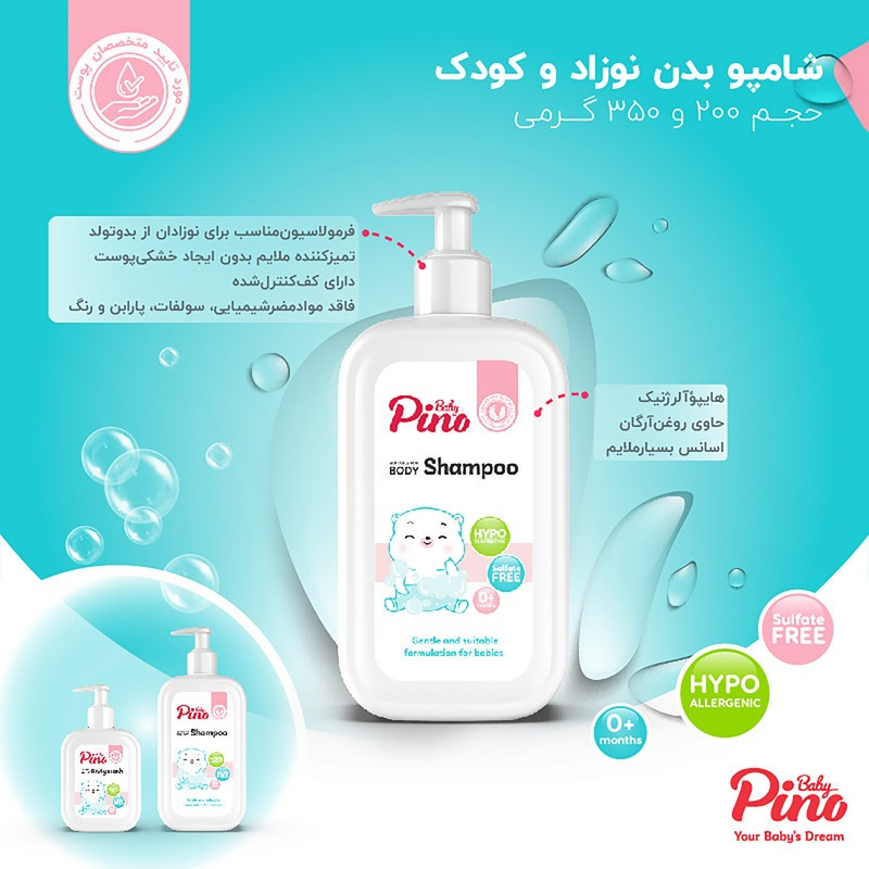 شامپو بدن نوزاد و کودک پینو بیبی بسیار ملایم و مناسب برای نوزادان (از بدو تولد) و کودکان طراحی شده است. جهت جلوگیری از ایجاد هر گونه حساسیت و آسیب، ترکیبات محصول کاملا مطابق با پوست حساس نوزادان انتخاب و فرموله شده است. تمیزکنندگی ملایم شامپوها بدون ایجاد عارضهی خشکی، حفظ لطافت و نرمی پوست را تضمین میکند. میزان کافی و اثرگذار روغن آرگان موجود در این محصول سبب ایجاد ویژگیهایی مثل آبرسانی و جلوگیری از ایجاد خشکی در اثر شستشو شده و در مجموع سبب حفظ سلامت ساختار پوست کودک میشود. تمامی شامپوهای پینو بیبی با توجه به حساسیت پوست نوزادان تازه متولد شده و کودکان، فاقد مواد مضر شیمیایی مثل سولفات، پارابن و رنگ بوده و همچنین هنگام شستشو سبب ایجاد حساسیت نمیشوند. در ساختار فرمولاسیون شامپوها از اسانسهایی کاملا هایپوآلرژنیک با رایحهای ملایم و دلپذیر استفاده شده که در کنار تمیزکنندگی مطلوبی که دارند، طراوت و شادابی را به پوست نوزاد و کودک میبخشند.