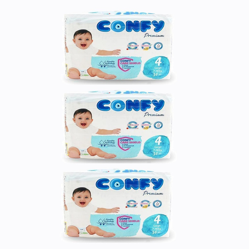 پوشک سایز 4 برند «کانفی» مدل پرمیوم یک پوشک برای نوزادان 7 تا 14 کیلوگرم است. لایه فوق جاذب، لبههای جانبی ضد آب، سطح فوقانی فوقالعاده نرم و لوسین از جمله مشخصههای این محصول هستند.تا زمانیکه کودک برای رفتن به دستشویی اراده پیدا کند، این پوشک است که از پوست او محافظت میکند. پوشک نامناسب، ممکن است موجب انحراف پاهای کودک، عفونت ادراری، حساسیت پوستی و بیماریهای جدیتری شود. لایه فوق جاذب به کار رفته در ساختار پوشک برند «کانفی» میزان جذب رطوبت را به حداکثر میرساند. همچنین وجود لبههای جانبی ضد آب در این پوشک، از عبور رطوبت به بیرون پوشک جلوگیری میکند. این پوشک که به خوبی جریان هوا را عبور میدهد، باعث تنفس راحت پوست نوزاد میشود. لوسین به کار رفته در تولید این پوشک نیز، پوست نوزاد را همواره نرم و لطیف نگه داشته و از بوی نامطبوع جلوگیری میکند. پوشک برند «کانفی» با دارا بودن نوار چسبهایی در قسمت کناری و جلوی پوشک به دفعات مورد نیاز، به صورت چسبی بسته میشود.پوشک برند «کانفی» با پوست لطیف نوزاد سازگار بوده و حساسیتی ایجاد نمیکند. لازم به ذکر است، بستهبندی این مدل دارای 28 عدد پوشک با سایز خیلی بزرگ است.