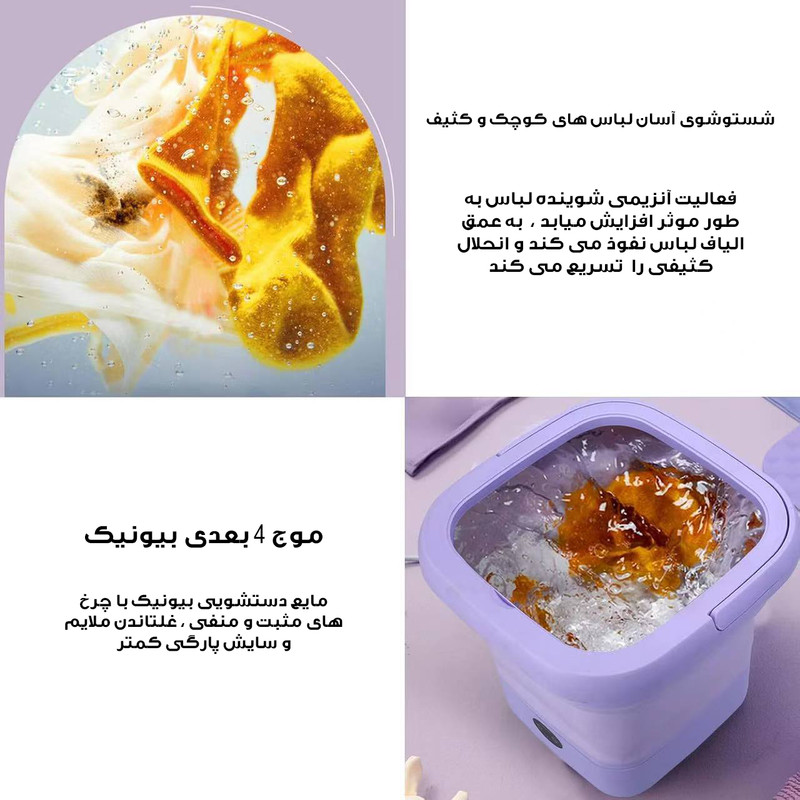 این مینی واش دارای قابلیت تنظیم تایم زمانی برای لباس های زیر و تی شرت است که در مدتزمان بین 5 تا 15 دقیقه، فرایند شستوشو را انجام داده و در مدتزمان کوتاهی لباسهای تمیز را تحویل میدهد. این مینیواش به رلهی حرارتی مجهز شده است تا از سوختن موتور جلوگیری کند. با اینکه توان شستوشوی بالایی دارد، مصرف انرژی آن پایین است و بدنهای از جنس پلاستیک دارد و از همه مهم تر تا شو هست و با ولتاژ 12 ولتی کار میکند
