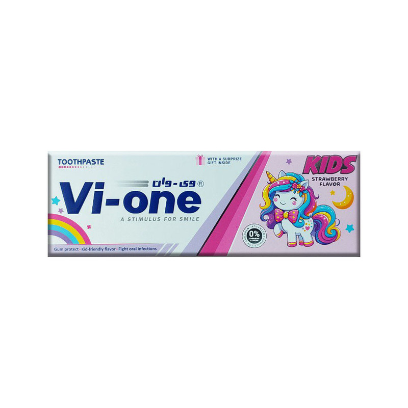 خمیر دندان کودکان vi-one برای سنین بالای 2 سال با طعم های توت فرنگی و آدامس بادکنکی و حاوی فلوراید (1000 ppm) جهت تامین فلوراید مورد نیاز دندان های شیری و دائمی است که به حفظ لبخند سالم و تقویت مینای دندان کمک می کند. این خمیر دندان بدون قند همچنین دارای شخصیت های کارتونی سرگرم کننده با طعم میوه ای است که بچه ها هنگام مسواک زدن از آن لذت خواهند برد. در صورت بهبود نحوه عملکرد این محصول با پزشک مشورت نمایید.