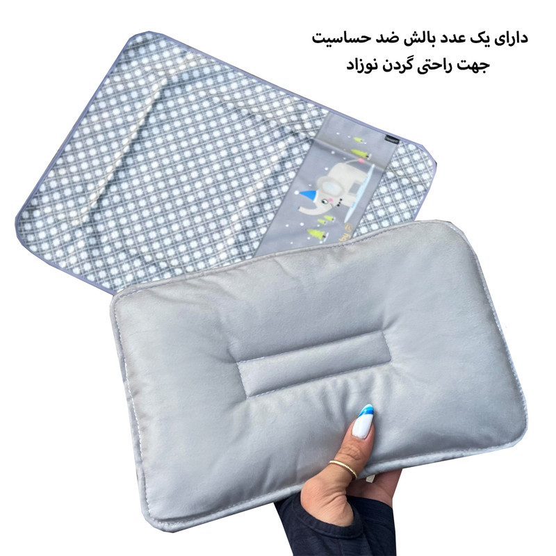 سایر توضیحات: دارای جنس بدنه مخمل پنبه ضد حساسیت و بسیار نرم دارای زیره قابل شست و شو و ضد آب دارای یک عدد بالش مجزا ضد حساسیت جهت راحتی گردن نوزاد مناسب جهت استفاده به عنوان سفره کودک - زیر انداز تعویض و زیر انداز سفری کودک قابلیت شست و شو