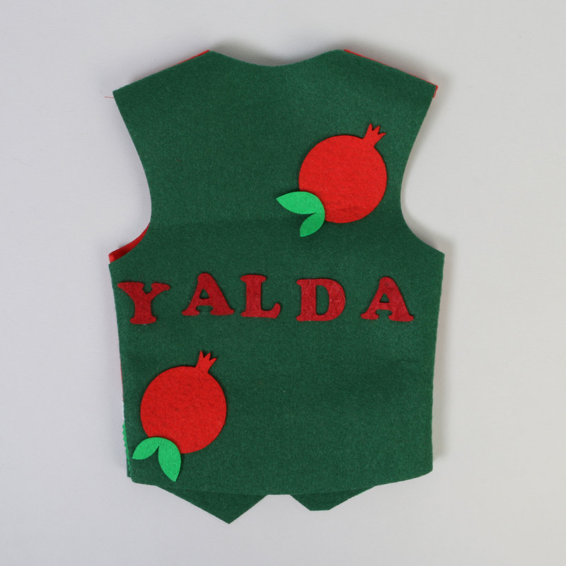 ژیله طرح هندوانه، ژیله یلدا دارای طرح برجسته هندوانه در جلو و طرح انار در پشت ژیله می باشد که مناسب دلبند شما در دورهمی های شب یلدا خواهد بود. رنگ زمینه ژیله قرمز بوده که بر روی آن طرح هندوانه به رنگ سبز می باشد. لبه دوزی ژیله نیز سبز رنگ است و کاملا تداعی کننده یک هندوانه می باشد که در تن کودک دلبند شما جذاب و زیبا خواهد بود. علاوه بر طرح برجسته هندوانه، طرح برجسته انار و نوشته انگلیسی YALDA بر پشت ژیله دیده می شود که جذابیت این محصول را بیشتر کرده است.