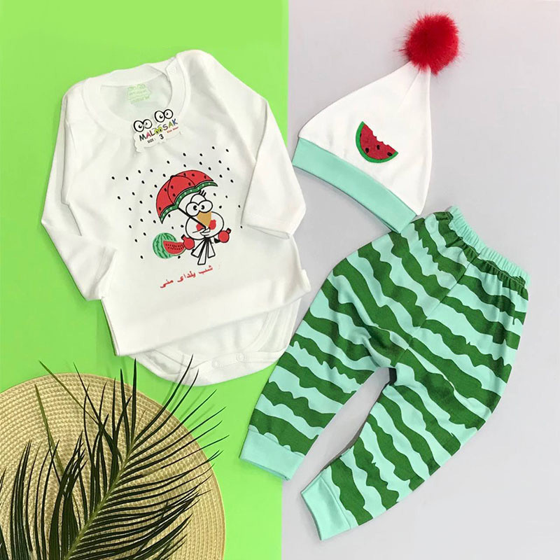 ست نوزادی شامل سرهمی، شلوار و کلاه پوم دار