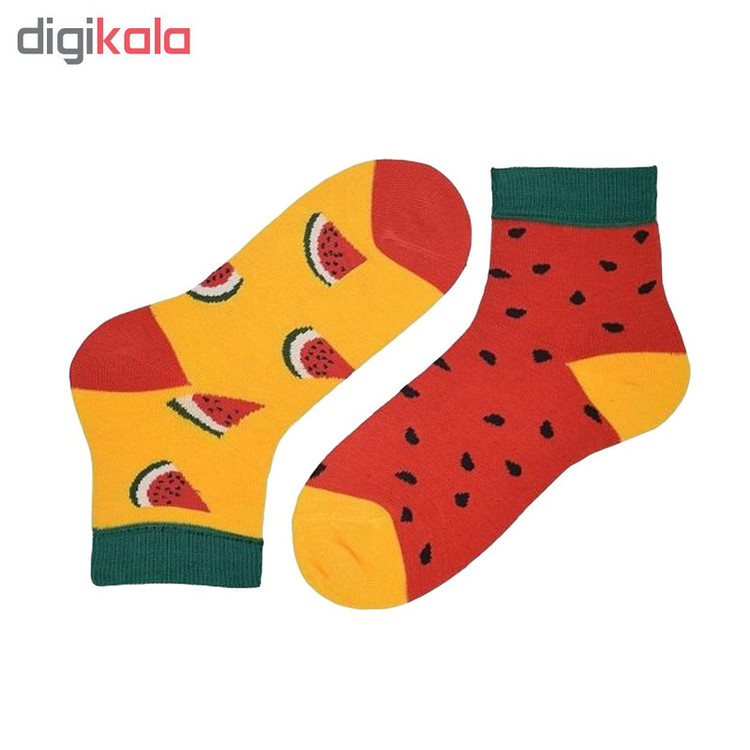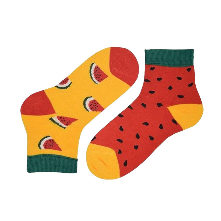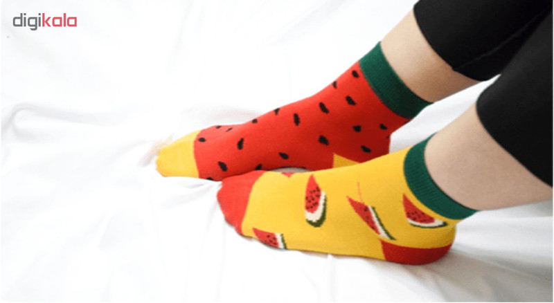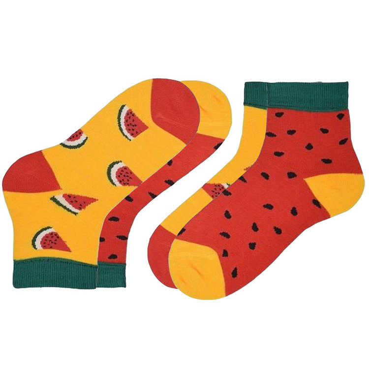 یک لنگه از جوراب طرحی از تکه های قاچ خورده هندوانه به رنگ زرد و لنگه ی دیگر آن طرحی از دانه های هندوانه و به رنگ قرمز میباشد