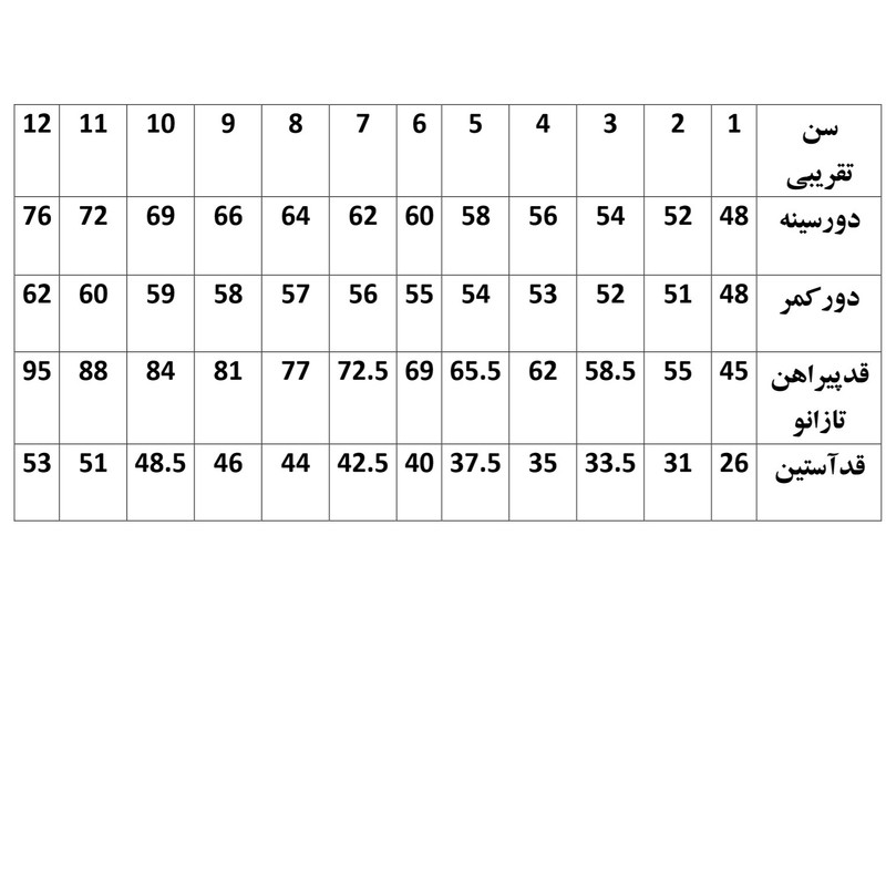 سایز بندی ها بر اساس استاندارد دوخته شده و سایز لباس براساس جدول سایز گالری تصاویر انتخاب گردد.
