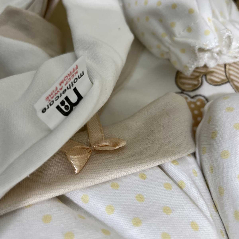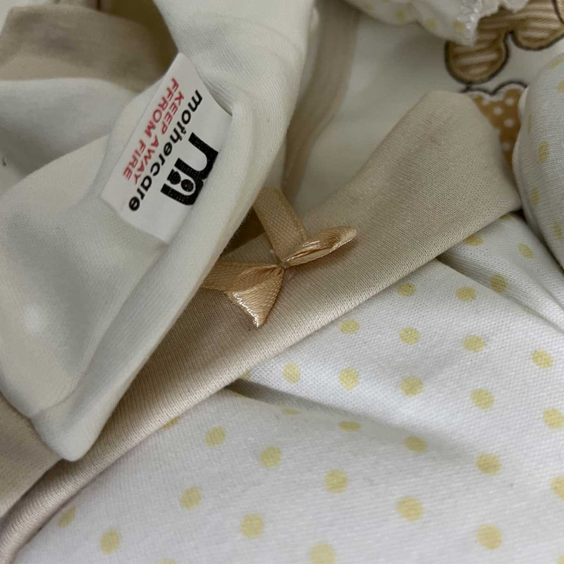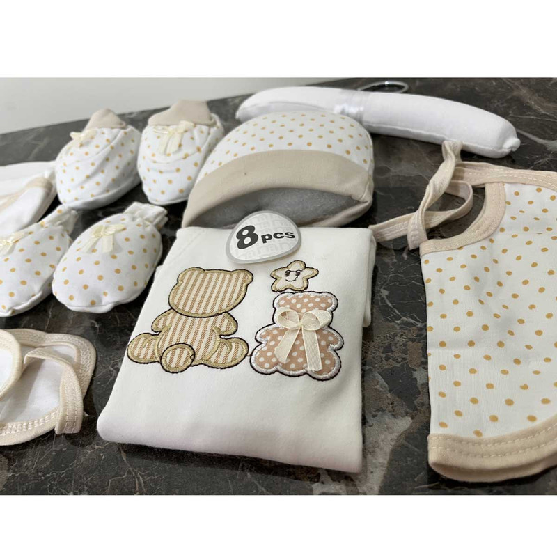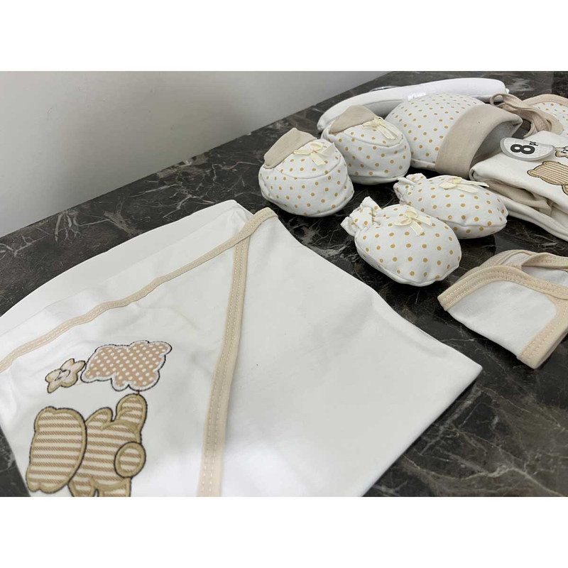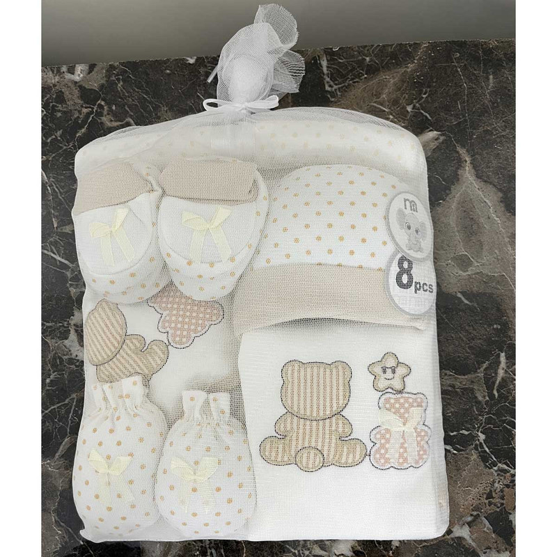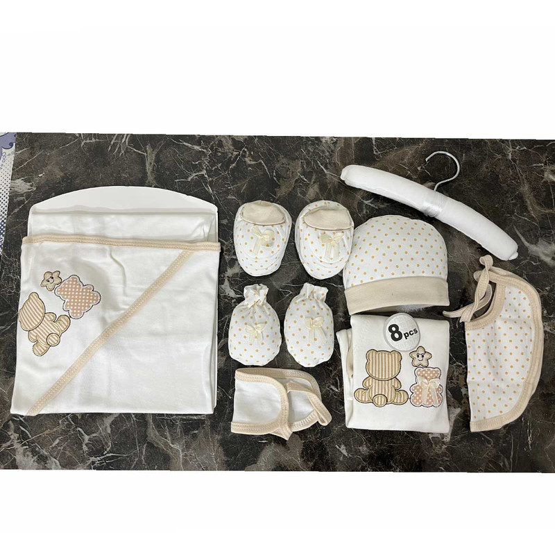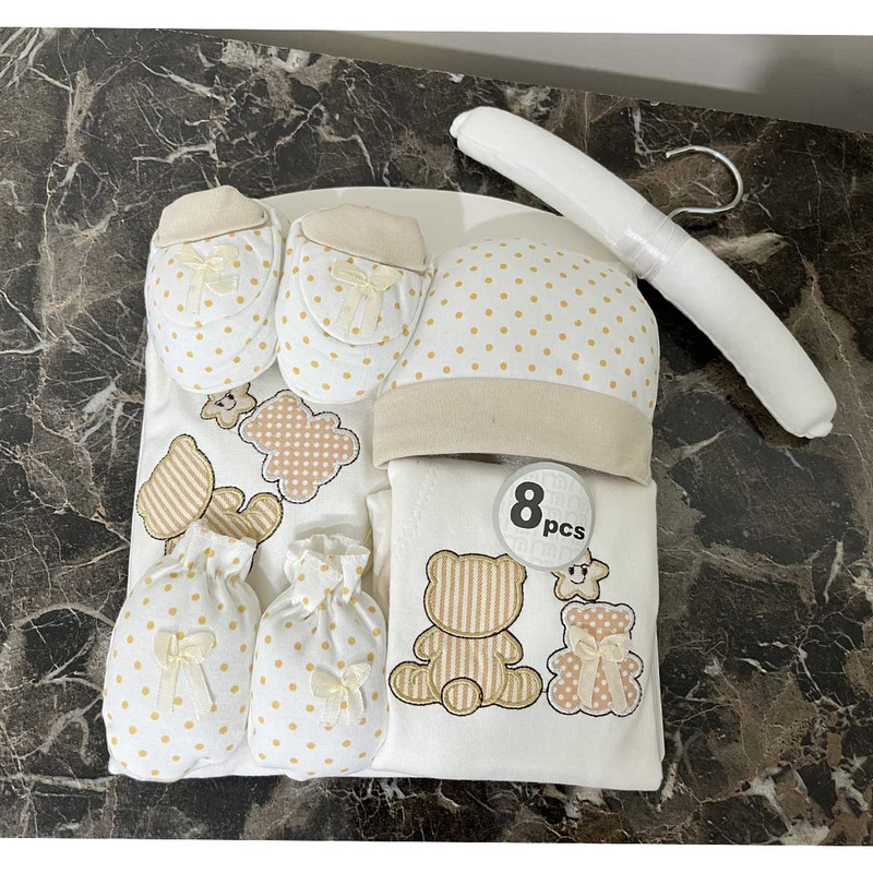 ست بیمارستانی (ست اغازین) 8 تیکه مادرکر شامل 1:چوب لباسی 2:سرهمی 3:دورپیچ 4:کلاه 5:پیشبند 6:یک جفت دستکش 7:یک جفت پاپوش 8:ناف بند، این ست از بهترین و با کیفیت ترین محصولات می باشد. این سرهمی و اقلام 8 تکه بوده که مناسب استفاده برای بدو تولد می باشد که به آن بیمارستانی نیز گفته می شود و با تهیه کردن این ست می توانید لباس و اقلام مورد نیاز کودکتان را در یک جا داشته باشید. همچنین همانطور که می دانید خرید سیسمونی برای نوزاد یک کاری بسیار حساس و همچنین زمان بر نیز می باشد. و از طرفی دیگر عده ای از والدین زمان کافی برای خرید تکی لوازم ندارند و به همین سبب استفاده از پک های آماده را ترجیح می دهند. همچنین یکی از بهترین و با کیفیت ترین لوازم نوزادی همین ست های مادرکر می باشد که از جنس بسیار با کیفیتی برخوردار می باشد و هیچ گونه آسیب و حساسیتی را برای کودک ایجاد نخواهد کرد. این ست ها در انواع طرح ها و رنگ ها در بازار عرضه می شوند و ست مورد معرفی ما طرح baby bear می باشد که بسیار جذاب و خاص می باشد.