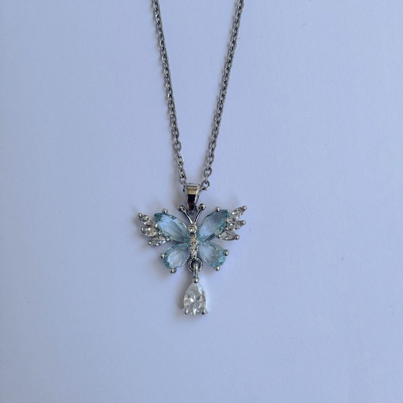 گردنبند با آویز پروانهای، ترکیبی از ظرافت، زیبایی و درخشش است که میتواند نقطه کانونی استایل شما باشد. زنجیر این گردنبند از استیل مقاوم و ضد حساسیت ساخته شده ، ماندگاری بالایی در برابر تغییر رنگ دارد. آویز پروانهای آن با چهار نگین شفاف آبی که بالهای پروانه را تشکیل میدهند و چند نگین کوچک سفید در قسمت بالها و بدن، طراحی شده است. همچنین یک نگین اشکی شفاف در پایین آویز، جلوهای لوکس و چشمگیر به آن بخشیده است.