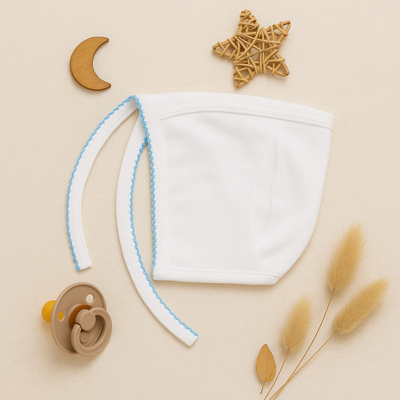لبههای آبی دوختهشده، جلوهای خاص و جذاب به این کلاه میدهند و آن را به گزینهای مناسب برای استایل روزمره و حتی عکاسی نوزاد تبدیل کردهاند. این کلاه سبک، تنفسپذیر و ضدحساسیت بوده و برای پوست لطیف نوزاد کاملاً ایمن و مناسب است.