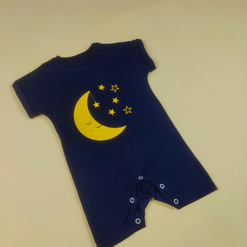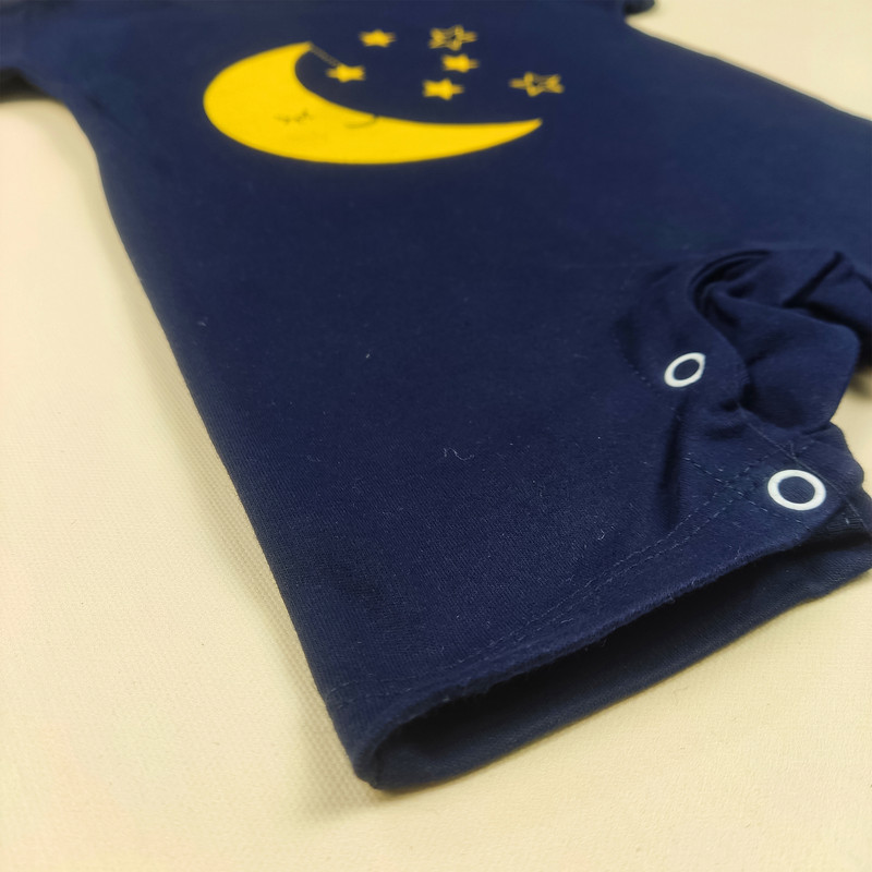 رامپر نوزادی طرح ماه یک لباس یکتکه بسیار راحت و کاربردی است که با پارچه فولپنبه تولید شده و برای پوست حساس نوزاد کاملاً مناسب است. این رامپر با زمینهی سرمهای و چاپ فانتزی ماه و ستارههای زرد، جلوهای کودکانه و جذاب دارد.