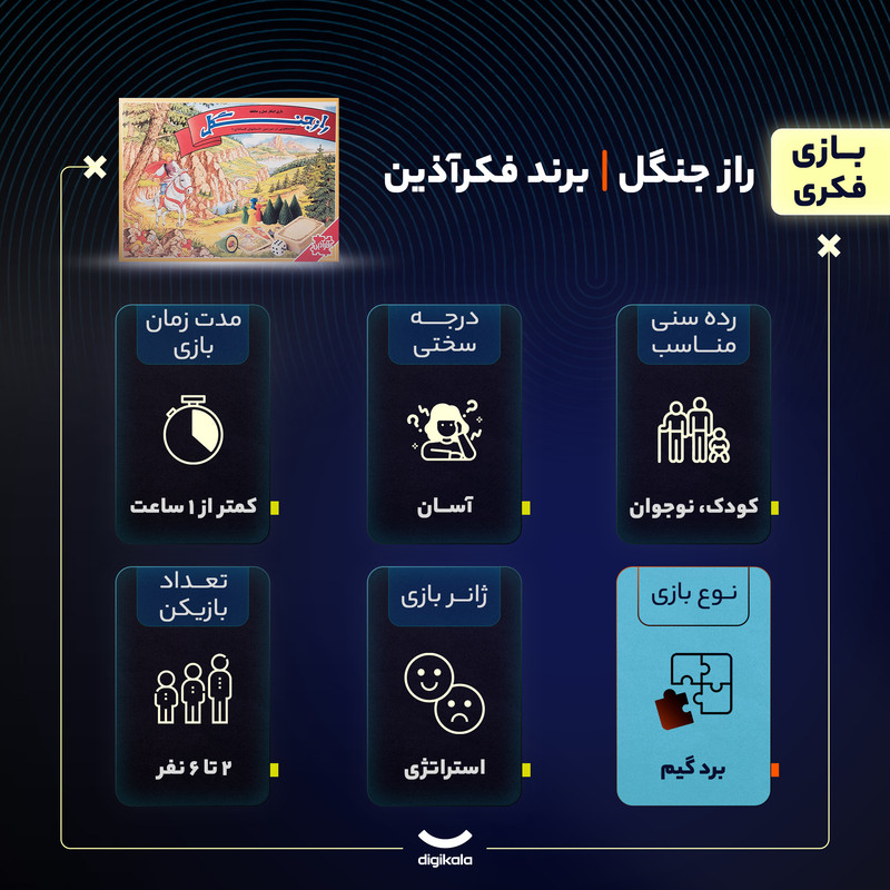 دستهبندی: بازی فکریژانر بازی: استراتژیمناسب رده سنی: کودک , نوجوانتعداد بازیکن: 2 تا 6 نفردرجه سختی: آسانمدت زمان بازی : کمتر از یک ساعتنوع بازی فکری : برد گیمنمایش بیشتر