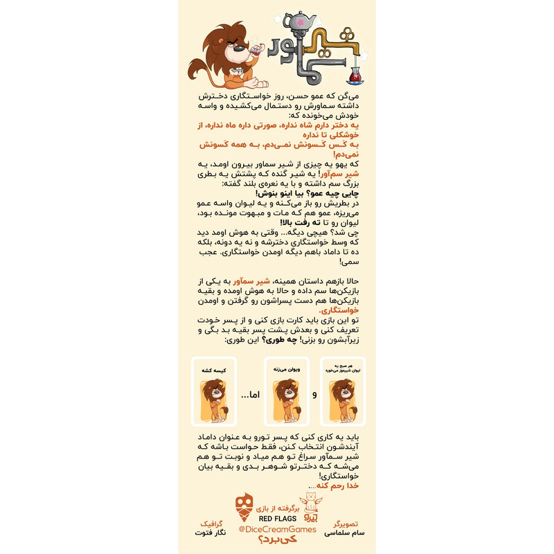 بازی شیر سماور یک بازی کارتی و بامزه مناسب مهمانیها که در آن قرار هست که به خواستگاری بریم و همه بازیکنان با کارتهای بازی از پسر خودشون تعریف میکنن و پسر بقیه خواستگارها رو دیس میکنن.