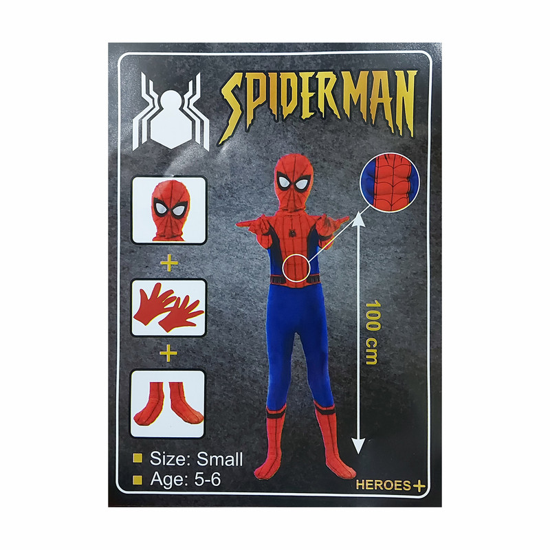 سایر اجزا: شامل کلاه پارچه ای طرح مرد عنکبوتی، یک جفت دستکش، یک جفت جوراب