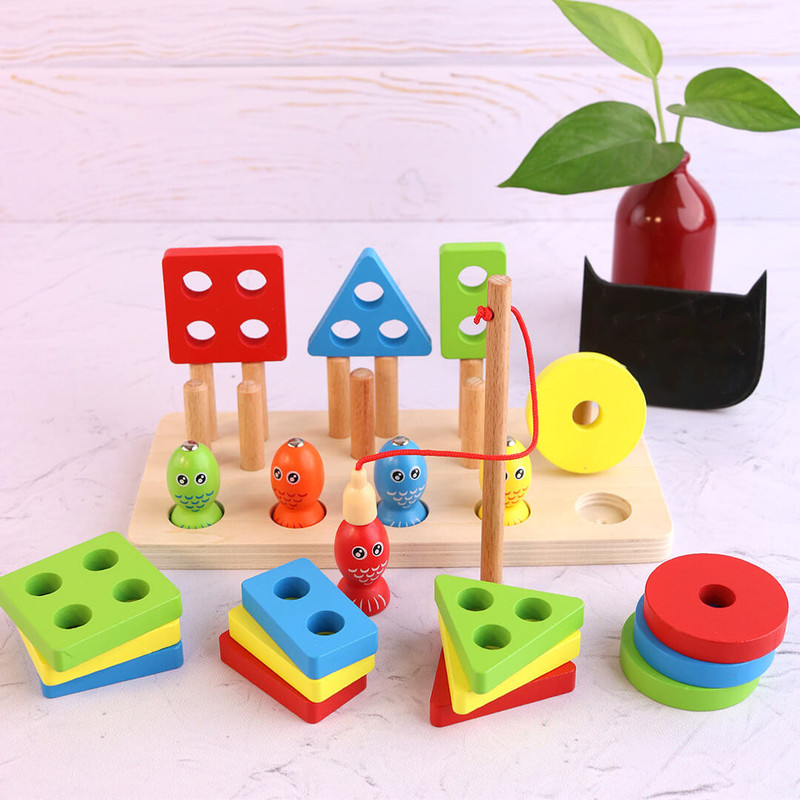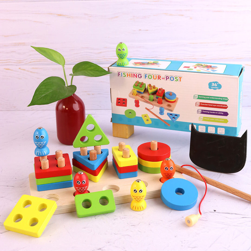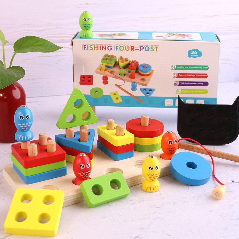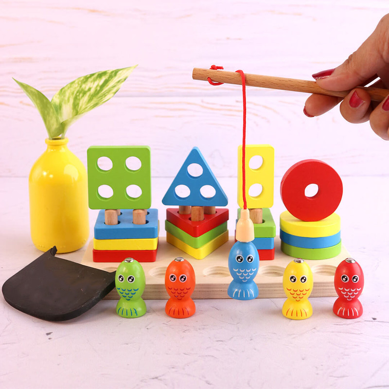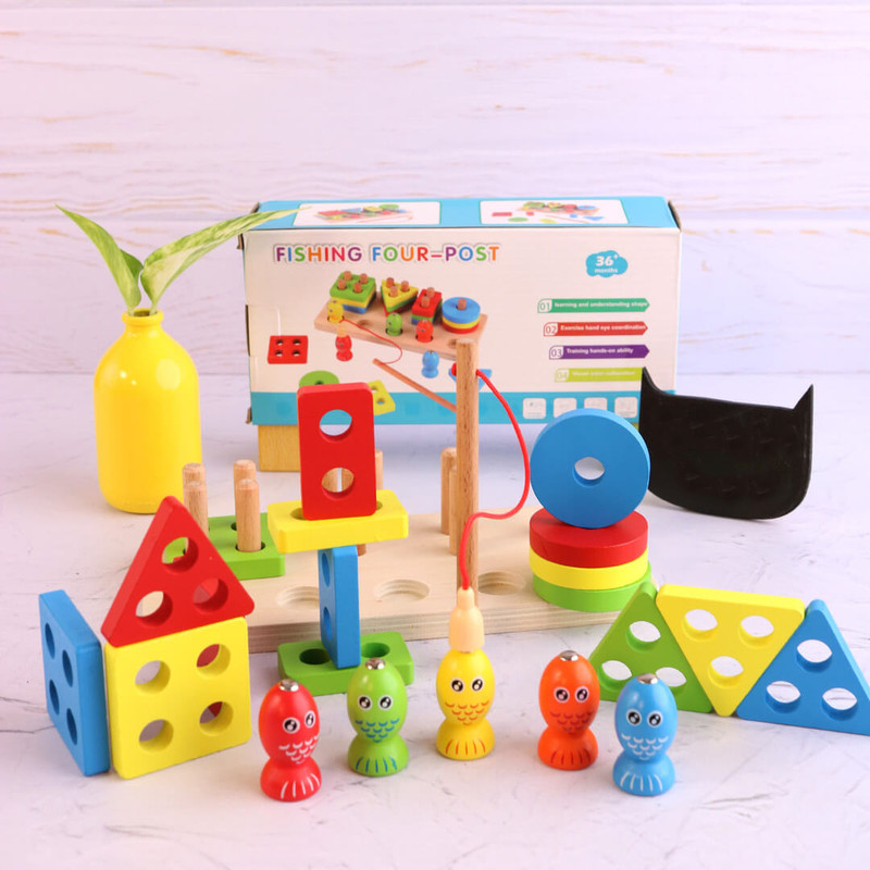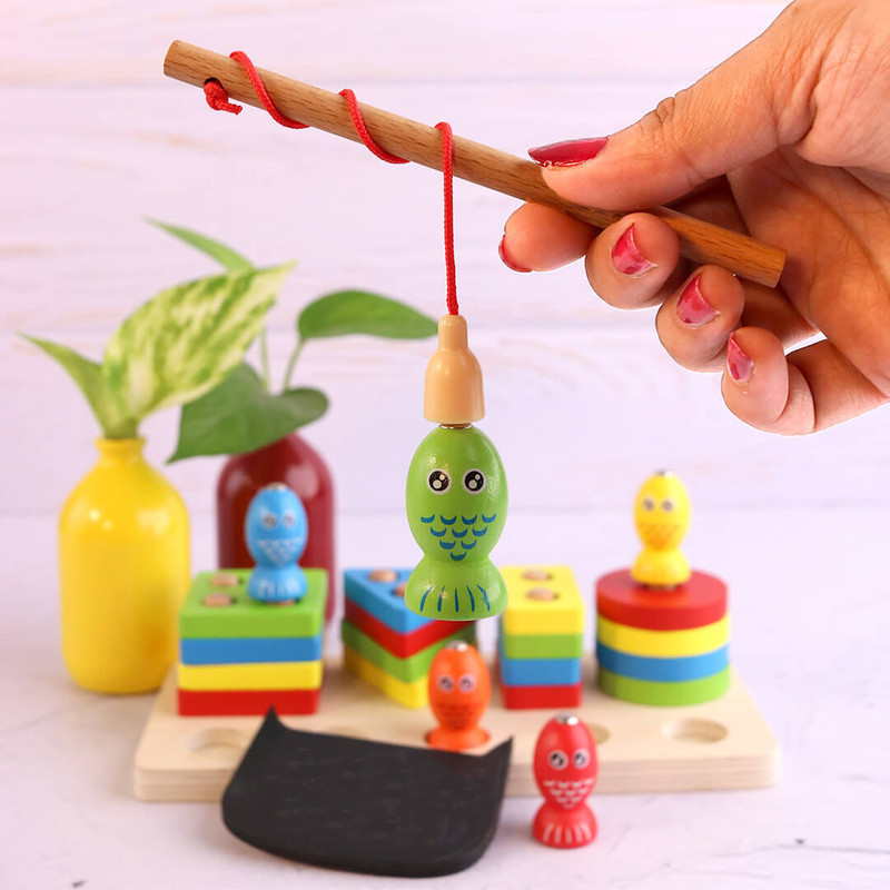 در بخش جلویی این پایه اشکال 5 عدد ماهی رنگارنگ آهنربایی درشت قرار گرفته که از جنس چوب با طراحی زیبا و جذاب است و یک قلاب چوبی هم همراه این مجموعه وجود دارد که کودکان با استفاده از آن تمرین ماهیگری می کنند. این کار تاثیر بسیار زیادی در افزایش توانایی دست کودک و هماهنگی دست و چشم او دارد.