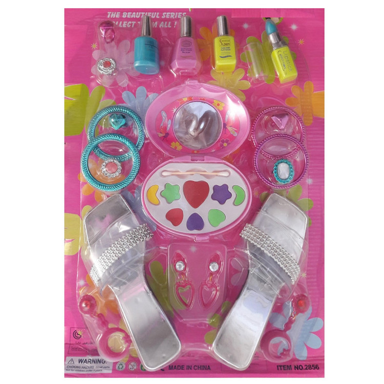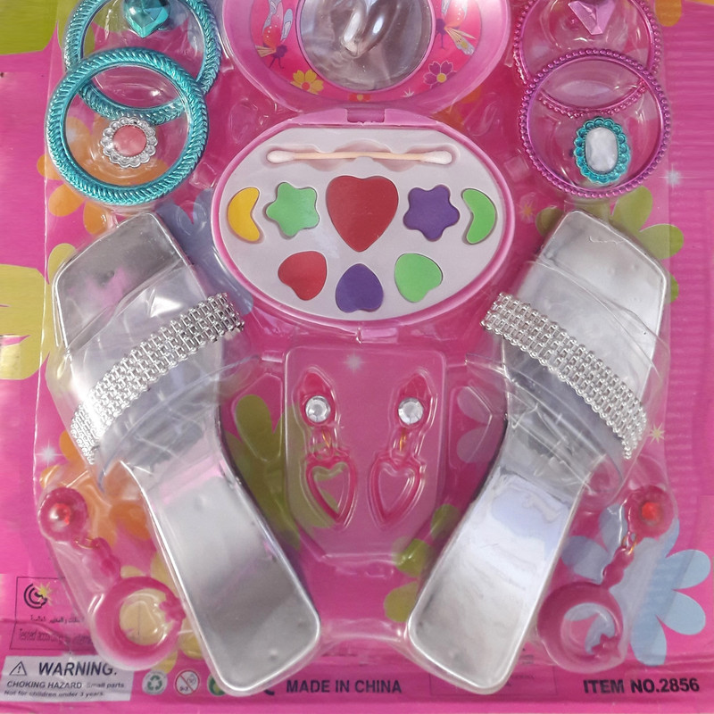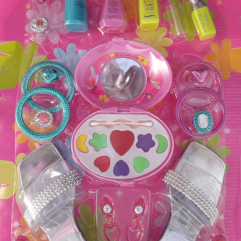 سایر توضیحات: دارای 22 قطعه لوازم آرایشی اسباب بازی ( آینه ، دمپایی مجلسی ،سایه ،لاک ، رژ لب ،گل سر ، انگشتر، و..)