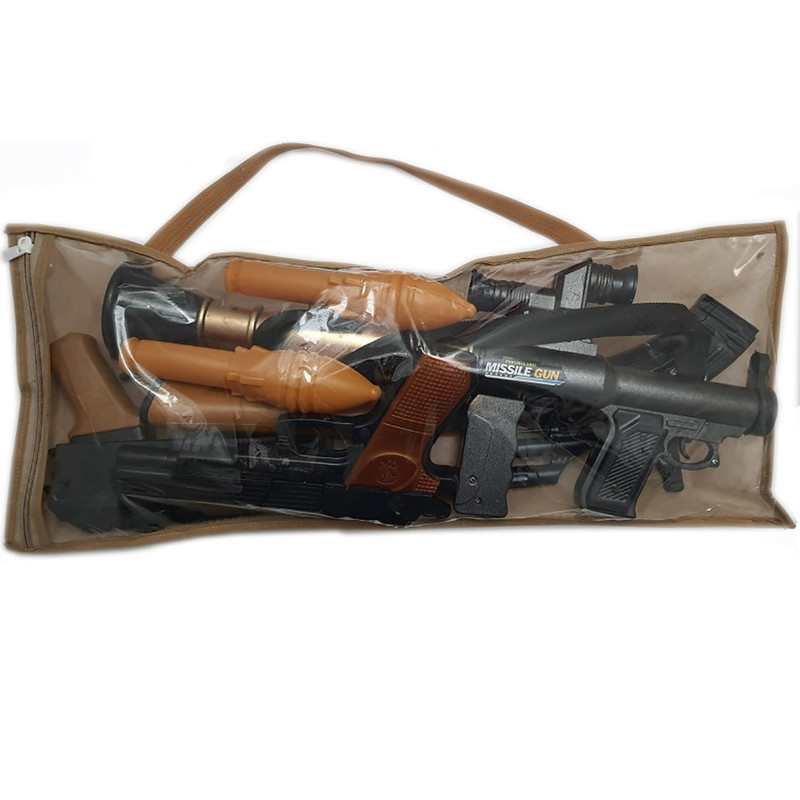 مجموعه تفنگ بازی که مکانیزم این محصول ترقه ای و پرتاب فنری بوده و از مواد درجه یک تولید شده است همراه این محصول 18حلقه دیسک ترقه و 2 تیر RPG بوده که ساعت ها می تواند شما را سرگرم کند بسته بندی این کالا به صورت کیف زیپ دار می باشد.این محصول تمام استاندارد های مربوط به اسباب بازی را پاس کرده و دارای نشان استاندارد از سازمان ملی استاندارد است.